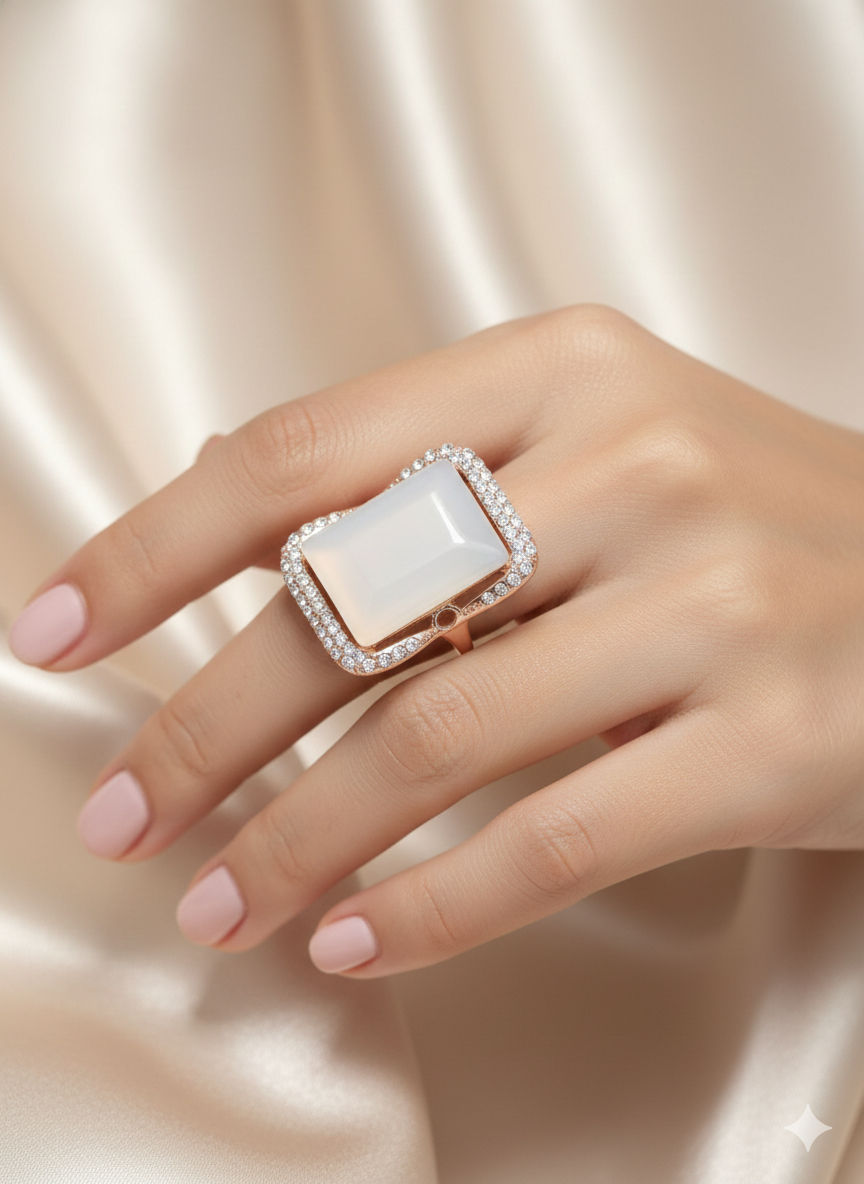 This elegant cocktail ring features a large, rectangular moonstone-style center with a smooth, milky finish. It is framed by a rose-gold-toned setting meticulously encrusted with shimmering pave-set crystals for a touch of glamour. The architectural, slightly curved silhouette gives it a modern yet vintage-inspired aesthetic, making it a sophisticated statement piece for any collection.